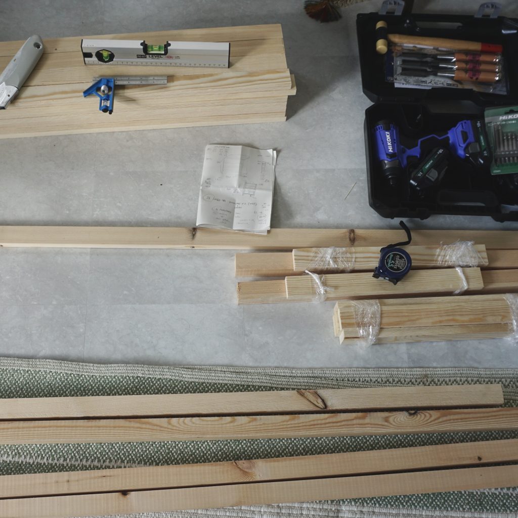 持ち帰った後、縦120cm・横90cm・奥行45cmの寸法になるように切ってから、棚の高さやそれぞれの間隔をイメージして墨付け。