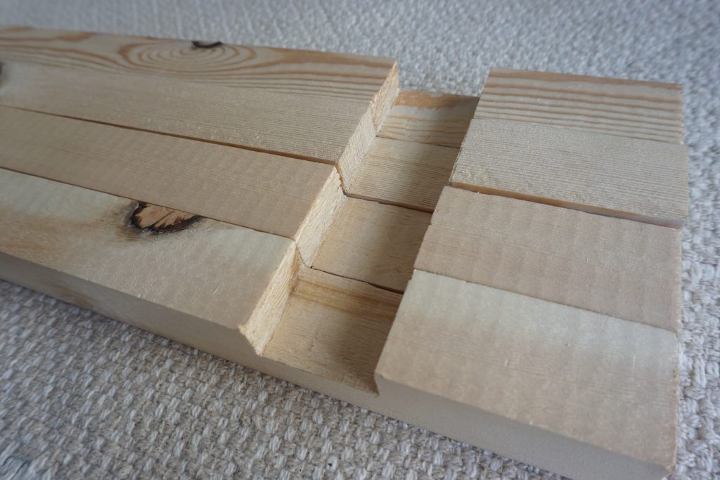 さて次に、棚板となる1×2材を置くための溝を、棚受けとなる1×2材に掘っていく。