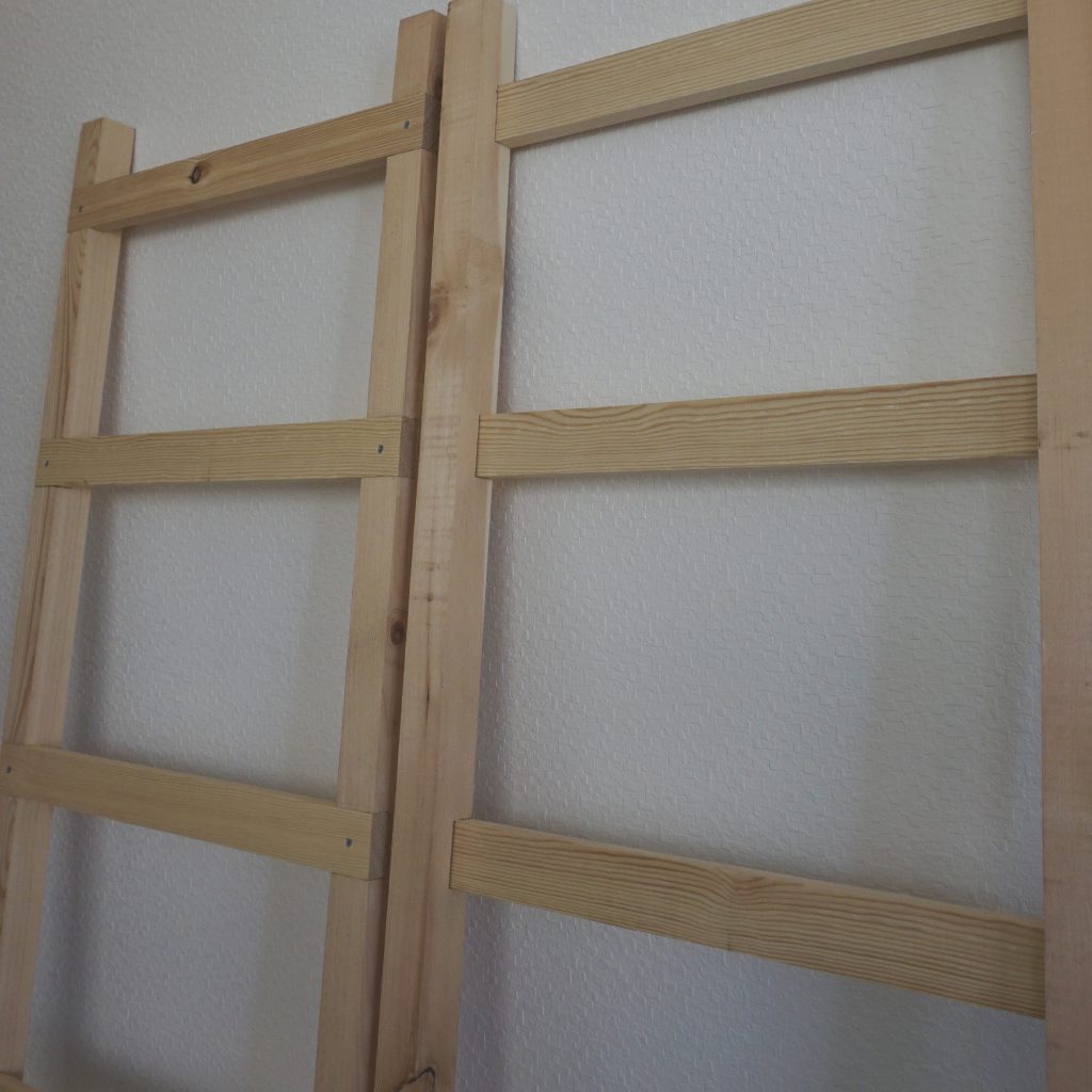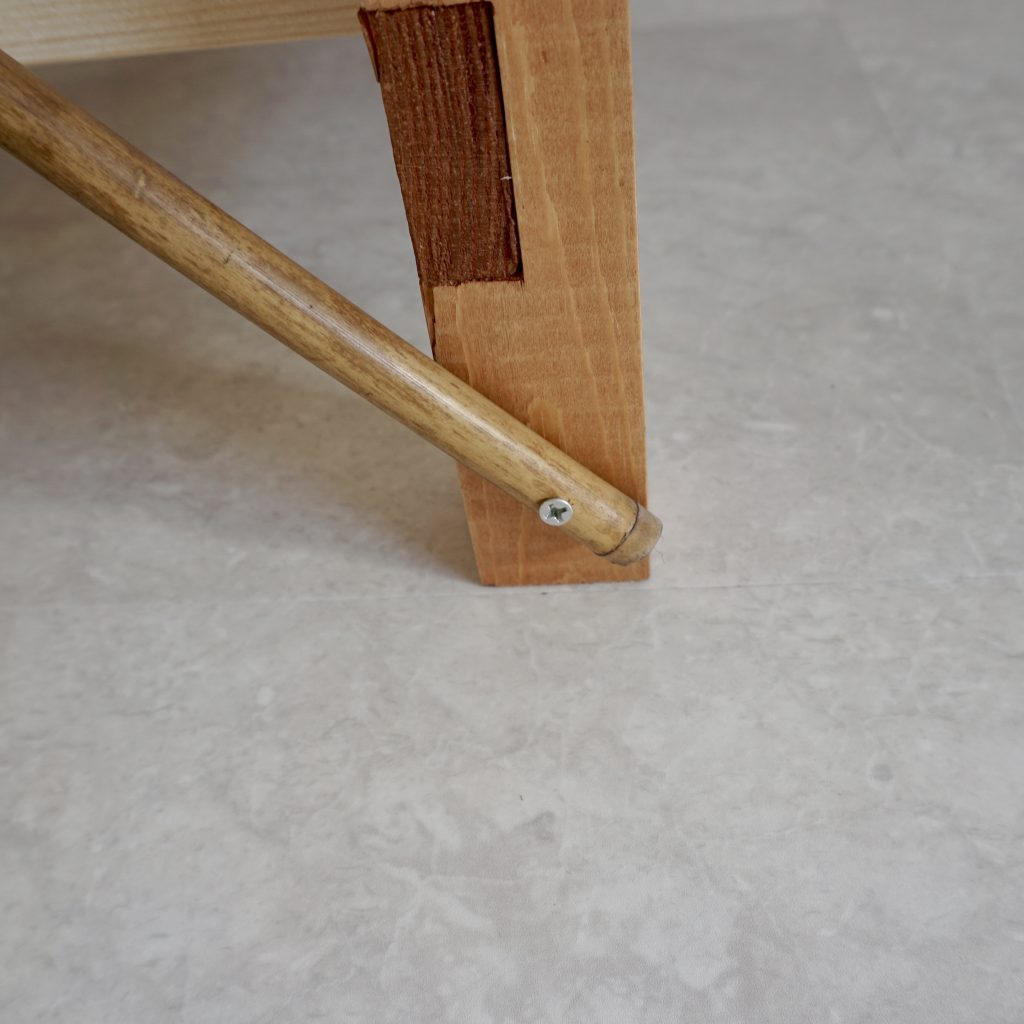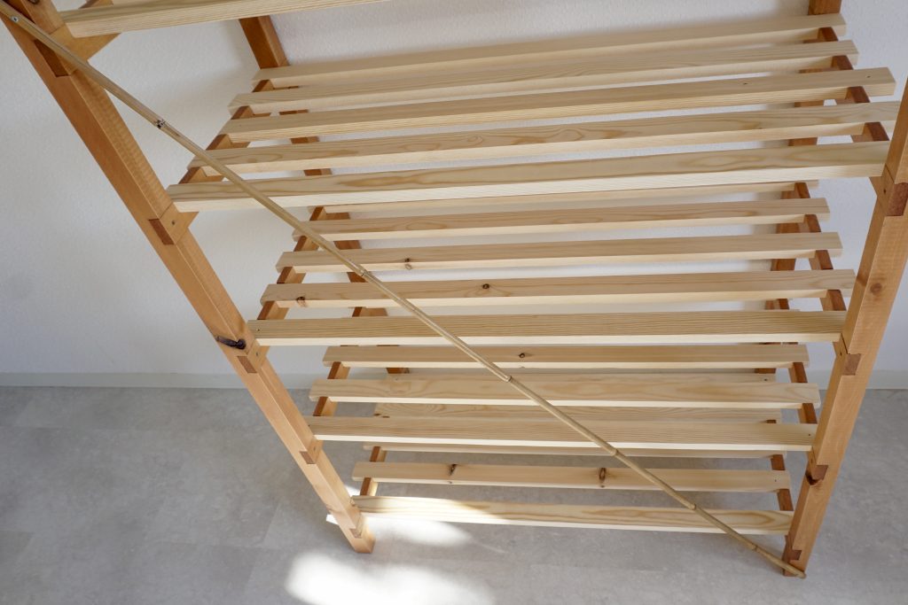 強度を上げるために筋交をいれて補強。たまたまあった細い竹の残りがいい仕事をしてくれた。細すぎかなと思ったけど、しなやかな竹は、いい具合に横揺れを抑えてくれる。