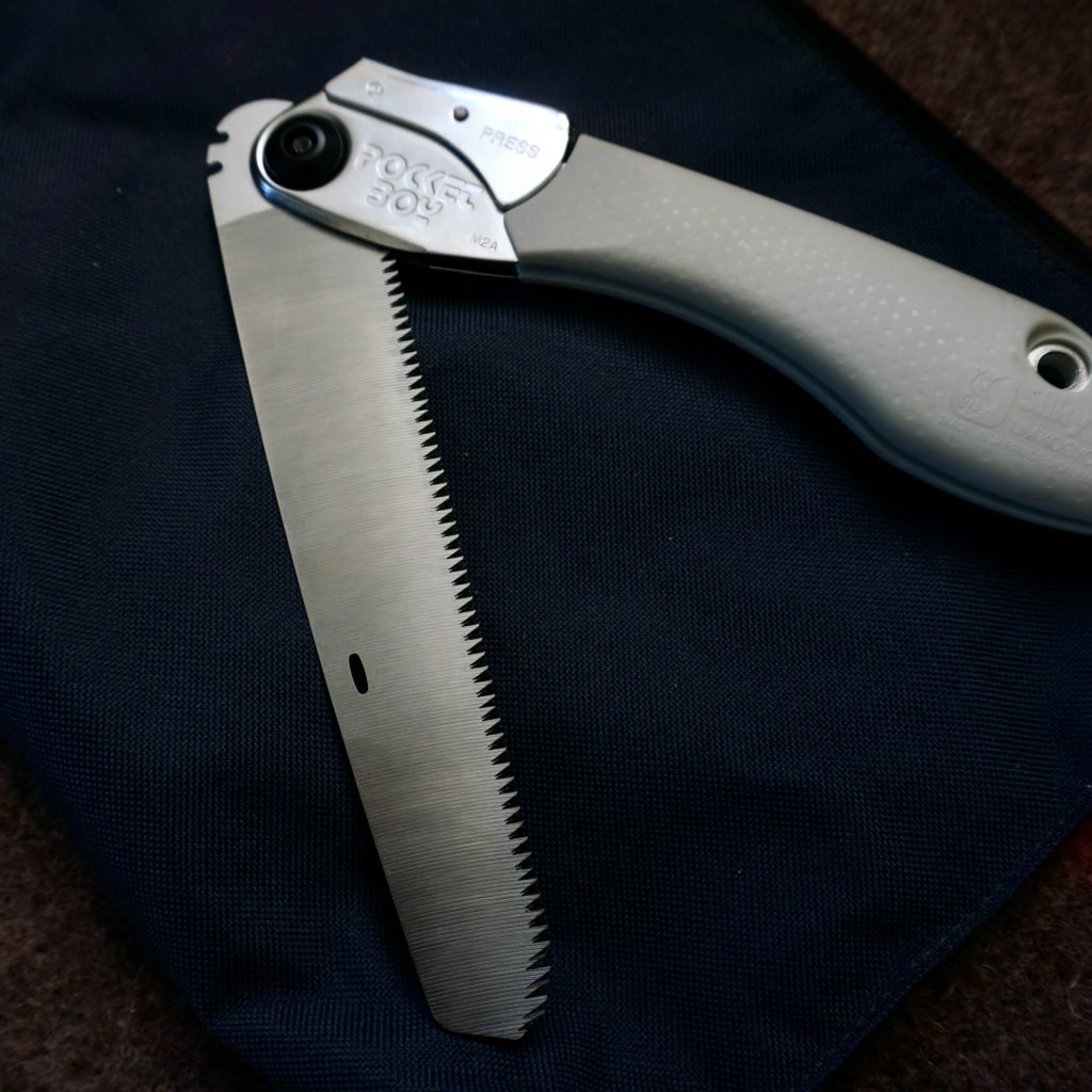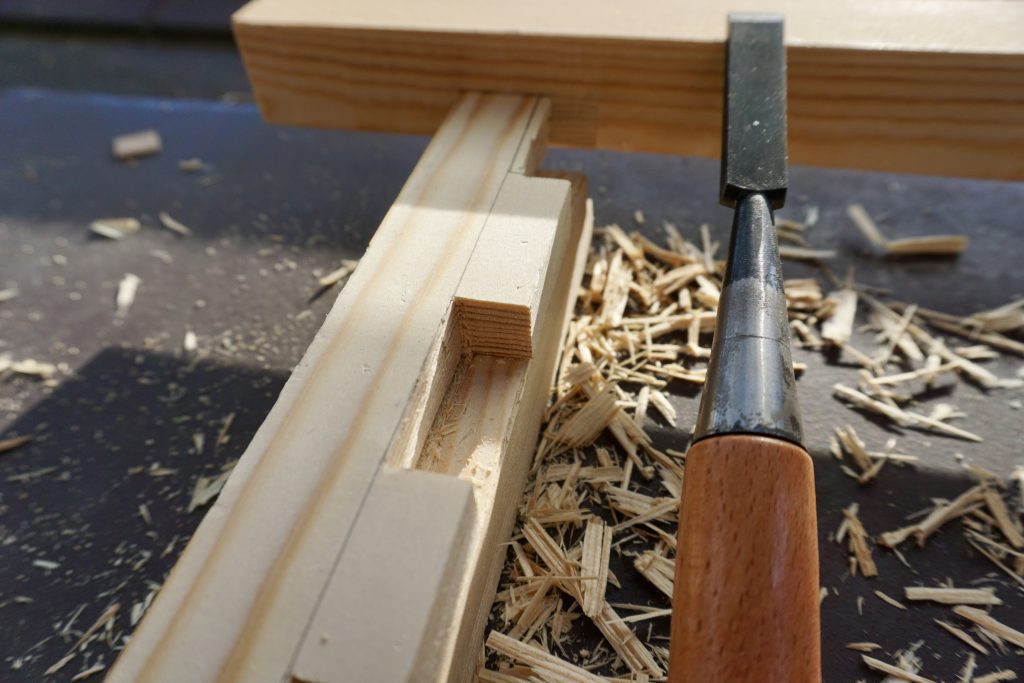 まず支柱となる2×2材にノミとノコギリで溝を掘っていく。ノコギリは評判の高い「POCKETBOY大工用」を使った。折りたためるようになっていて、刃の角度を2段階で調整できるのでとても使いやすい。