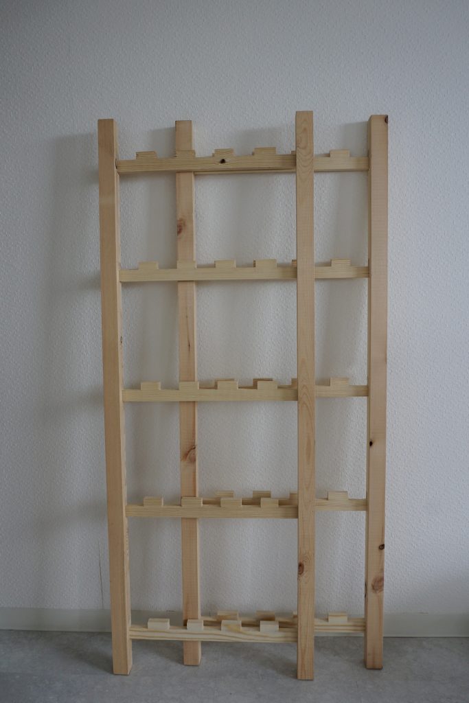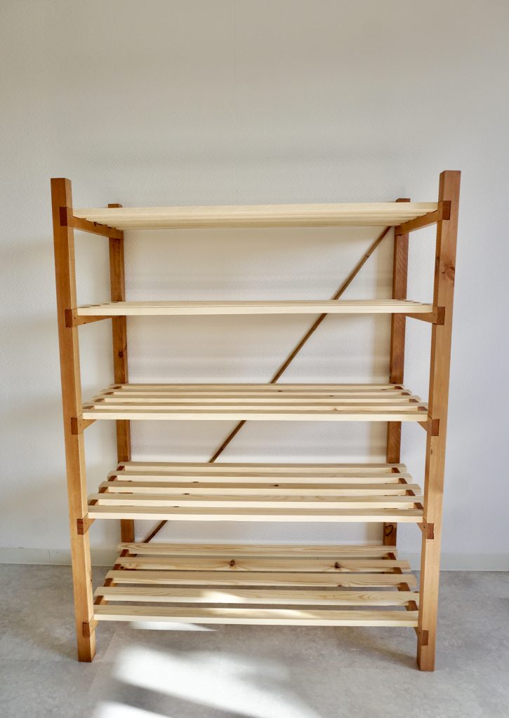 木の風合いをあまり変えずに、簡潔なデザインで、住処が変わってもバラして移動できて、間取りに合わせて幅を変えられる。そんな棚をつくっていきます。