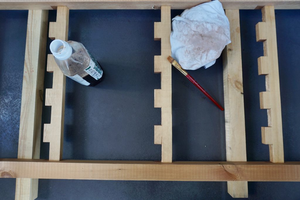 塗装にかんしては、はじめは紅色と深緑の組み合わせをイメージしていたけど、最終的には木の色を活かした塗装にしたいと思っていたところ、備後柿渋という塗料にたどり着いた。