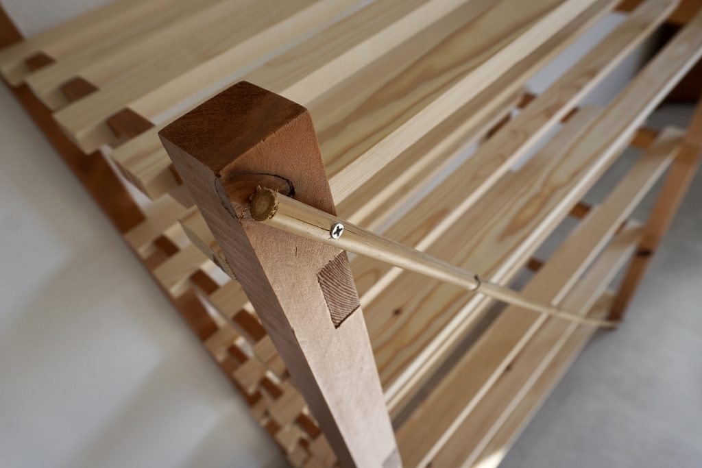 欠き取った溝に、棚受けとなる1×2材をはめていく。「カギ込み」と呼ばれる技法。こうすることで、釘やビスだけで接着するよりも強度が上がる。